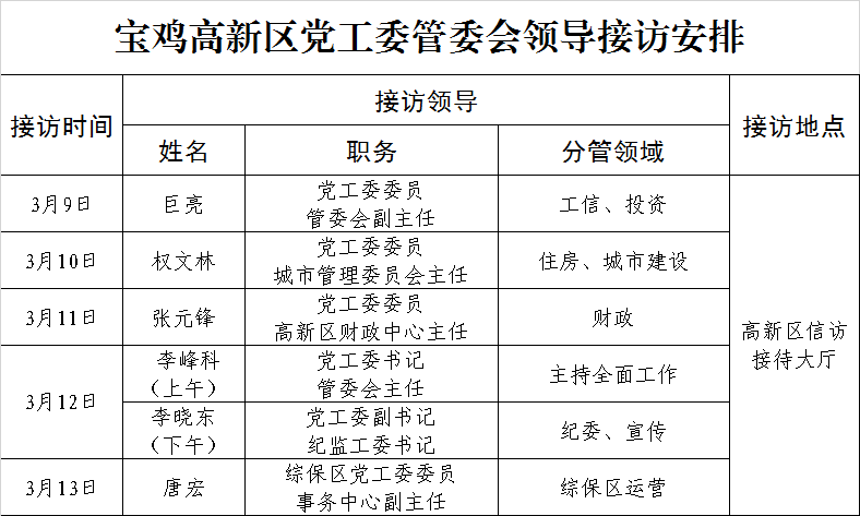 宝鸡高新区党工委管委会领导接访安排(3月9日—3月13日)