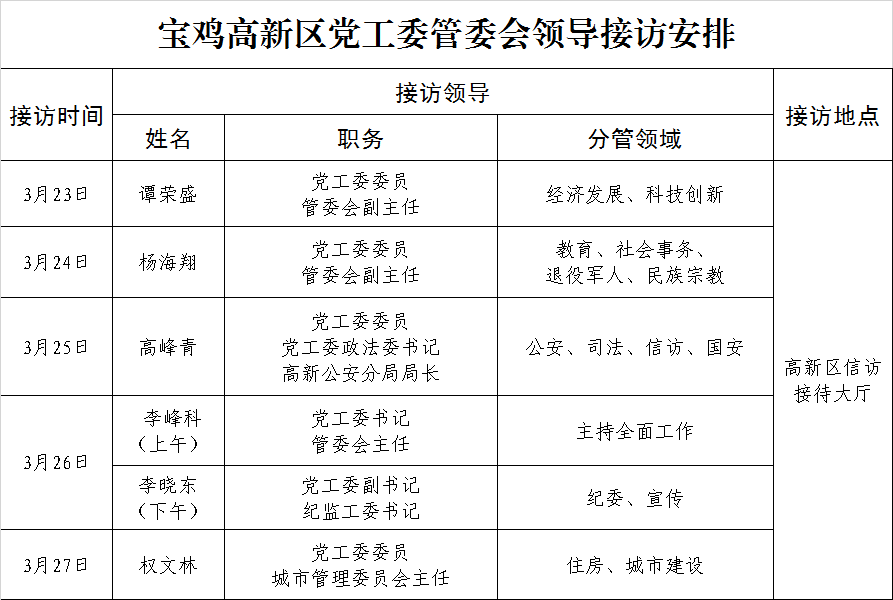 宝鸡高新区党工委管委会领导接访安排(3月23日—3月27日)