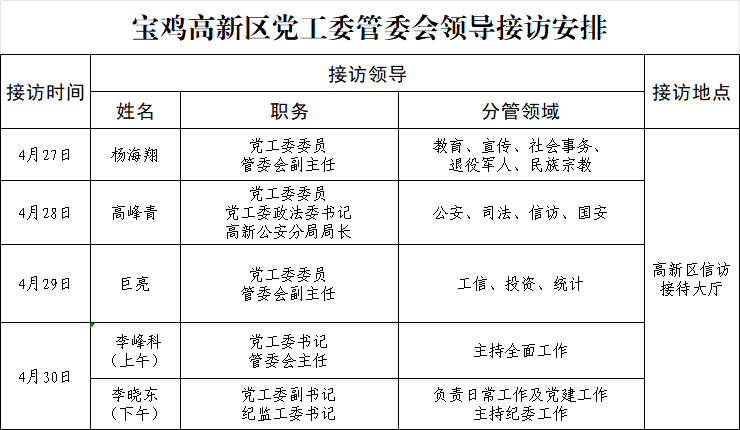 宝鸡高新区党工委管委会领导接访安排